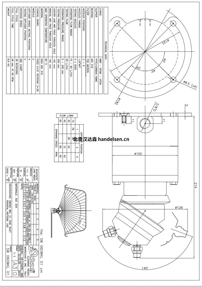3.自旋轉(zhuǎn)清洗頭,無需任何潤(rùn)滑劑 材料:Aisi 316 流量:最大 200 升/分鐘 壓力:最大 200 巴 旋轉(zhuǎn)速度:流量 過濾器:是 進(jìn)水口:軸向 噴嘴:2-4 應(yīng)用:180° 扇形清洗